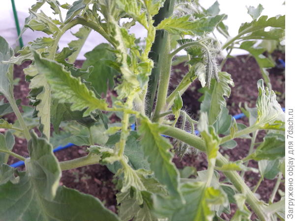 Листья томатов (инденты) в нижней части растения — крупные и зеленые (глаз радуется). Выше листья мельчают, с обратной стороны жилки — фиолетовые. Помогите, пожалуйста, разобраться в чем причина и как исправить ситуацию.