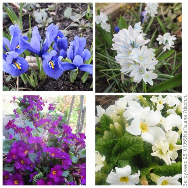 Цветут они с ранней весны. Как только растает снег, — первоцветы: мелкие ирисы, пушкиния, примулы и др.