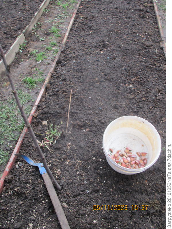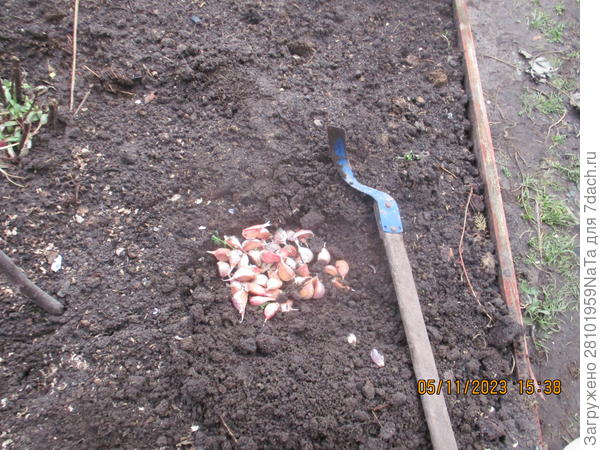 Засыпаю зубчики землей, делаю какую-то метку около этой ямки, ставлю палочку или еще чем-то помечаю, и все. Оставляю все это до весны.