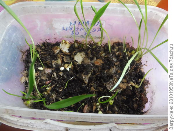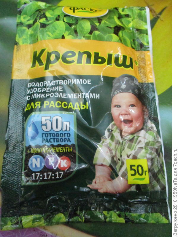 Накрыла емкость с чешуйками пленкой и поставила в теплое место для прорастания, иногда проветривая. Когда из чешуек начали появляться маленькие тоненькие росточки, их нужно присыпать слегка землей, открыть пленку и подкормить. Когда подкармливаю первый раз проросшие чешуйки лилий, я использую удобрение для рассады «Крепыш».