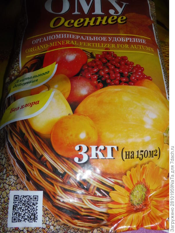 Осенью обязательно подкармливаю малину, обычно кладу под каждый куст какое-то осеннее удобрение, в этот раз положила «ОМУ осеннее».