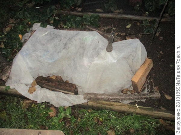 Еще раз поливаю землю водой около бутылок, под которыми находятся черенки роз, и закрываю их сверху укрывным материалом.