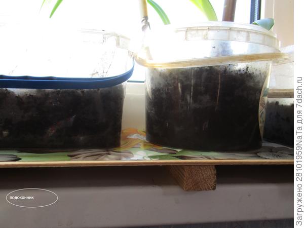 Иногда подоконник заставлен вплотную емкостями с рассадой, и никакого проветривания нет. А если емкости с рассадой поставлены на подставки, то внизу хорошо проходит воздух. Подставки на подоконник, конечно, лучше покрасить, но я пока положила на них термосалфетку. Растениям на таких подставках немного теплее, чем на самом подоконнике.
