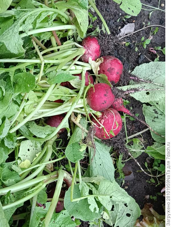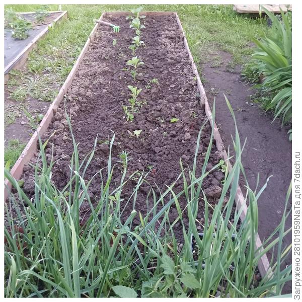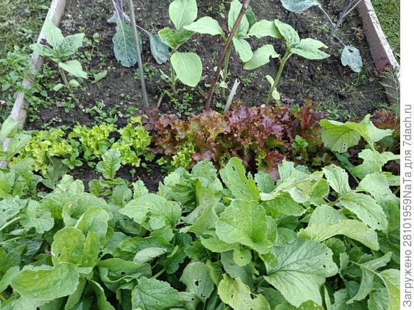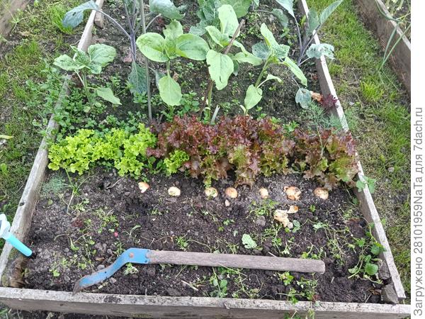 Редис вырос, я его убрала, посею на его место укроп или петрушку, а еще после уборки редиса посадила около салата несколько крупных головок лука на зелень. Салат уберу, а лук на зелень будет расти.