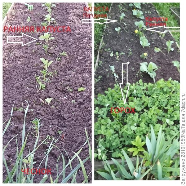 Когда ранняя капуста вырастет, я ее убираю и оставляю на грядке только позднюю. Таким способом они вырастают на одной грядке. А по краям грядок с капустой сажаю чеснок, зелень и часто — ранний горох два раза за сезон.
