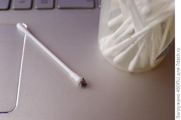 Быстро почистить клавиатуру помогут косметические ватные палочки и медицинский спирт. Палочки отлично собирают всю пыль между кнопками, влажная вата хорошо впитывает грязь, а т.к. спирт быстро высыхает, то нет опасности, что влага попадёт внутрь клавиатуры.