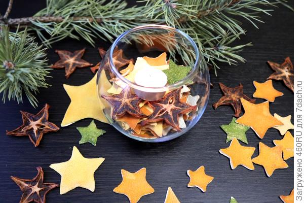 По размеру из кожуры вырезать звезду. Можно сделать дырочку и продеть нитку, тогда звезду можно будет подвесить.