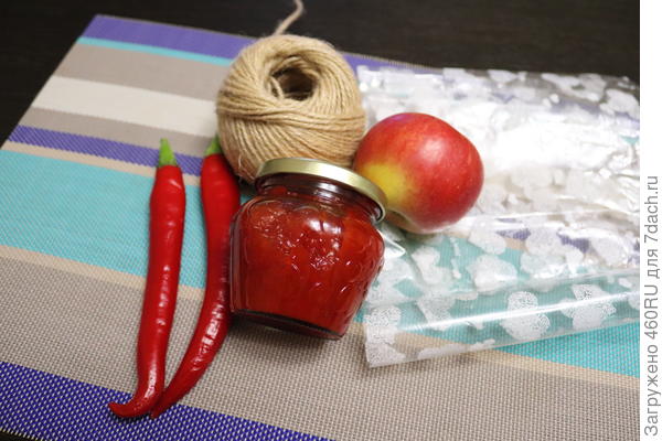 Я хочу презентовать баночку острого соуса, который приготовила сама, как его приготовить — прочитаете по ссылке, если захотите. В составе есть яблоки и перец чили, их я тоже положу к банке соуса.
