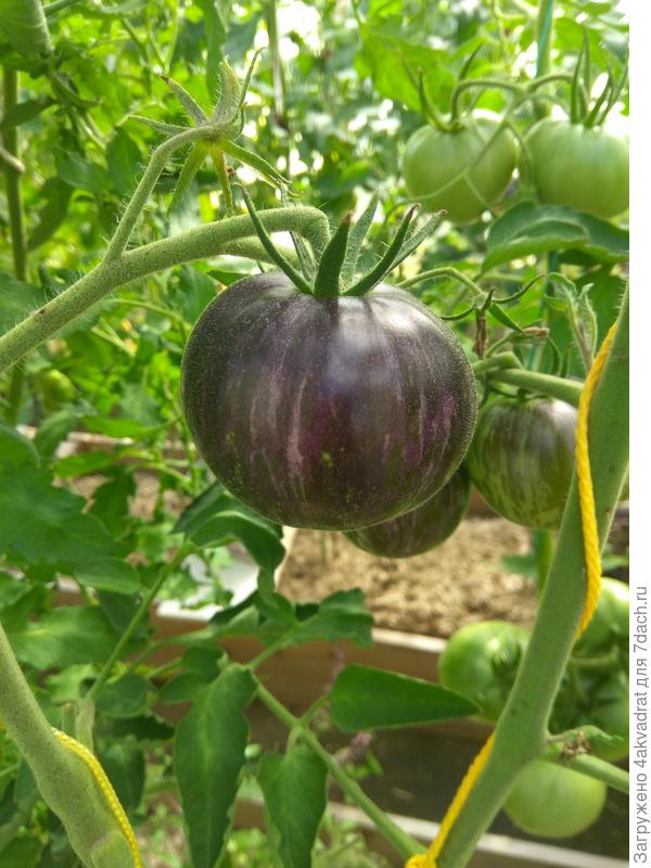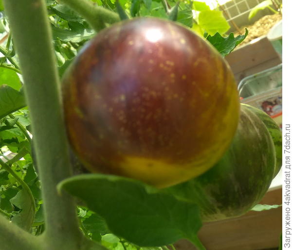 Самый необычный по окраске, конечно – 'Мятежный звездный истребитель – Ведущий', мои приятельницы долго смеялись, когда они спросили название заинтересовавшего их сорта, а я его «выдала». Но в теплице томат сразу обращает на себя внимание своей окраской, темно-фиолетовые полосы на темно-бордовом фоне, а при разрезе красивый насыщенный цвет. Довольно мясистый, вкус очень приятный томатный, сбалансированный, ни тебе лишней кислоты, ни лишней сладости. Похвастаться большой урожайностью не могу. Но думаю, что это моя вина, так как в этом году при выращивании рассады я допустила грубейшую ошибку, которая снизила мне урожайность фактически всех томатов, но об этом в конце.