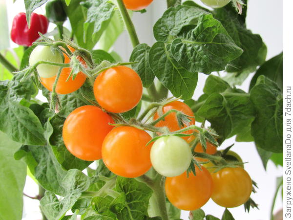 К красноплодным черри вы можете посадить супердетерминантные оранжево- и желтоплодные сорта 'Оранжевая Шапочка' и 'Желтая Шапочка'. Сроки от всходов до созревания у обоих — 85-90 дней. Именно детерминантные (а значит, низкорослые) и супердетерминатные (практически карликовые) томаты лучше всего подходят для выращивания дома.
