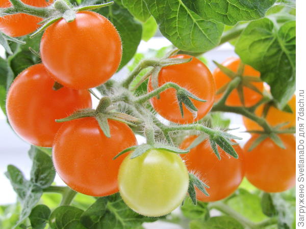 Эти компактные раннеспелые мелкоплодные сорта не требуют формирования, пасынкования, подвязка растениям тоже не нужна. В большинстве своем томаты черри с некрупными сладкими плодами вкуснее всех остальных. Содержание сахаров в них в 2-3 раза выше, чем у обычных сортов томата.Красноплодные томаты черри 'Беби', 'Красная россыпь', 'Красная Шапочка' имеют яркие, нарядные плоды массой 15-20 г. Срок от всходов до созревания у этих сортов от 80 до 90 дней. Однако он всегда зависит от созданных условий и может отличаться от заявленного. Это правило справедливо для всех овощных культур.
