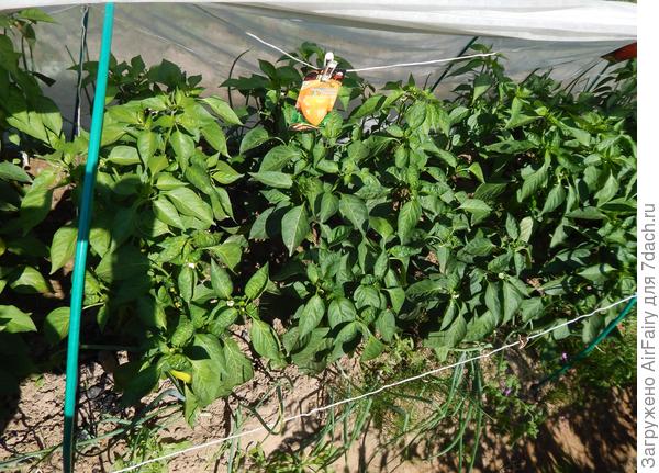 Рекомендуемая производителем схема размещения 50х30 см, т.е. на 1 м² располагается ~ 12 кустиков. На нашей гряде получилось ~ 12 кустов на 1 м², в т. ч. 5 тестируемых перчиков 'Златень'.