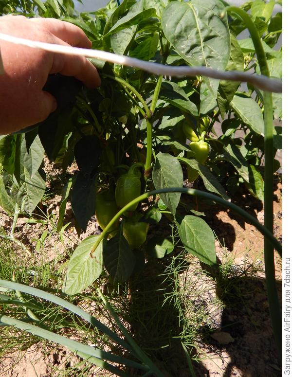 От себя хочу отметить, что при высадке стоит хорошо удобрять молодые растения. В качестве подвязок использовала кусочки агроспана, чтобы не повреждать растения. В моем случае, в гости к перчикам мы заходили 2 раза в месяц, в остальное время перцы находились в состоянии покоя и роста в естественных условиях:
