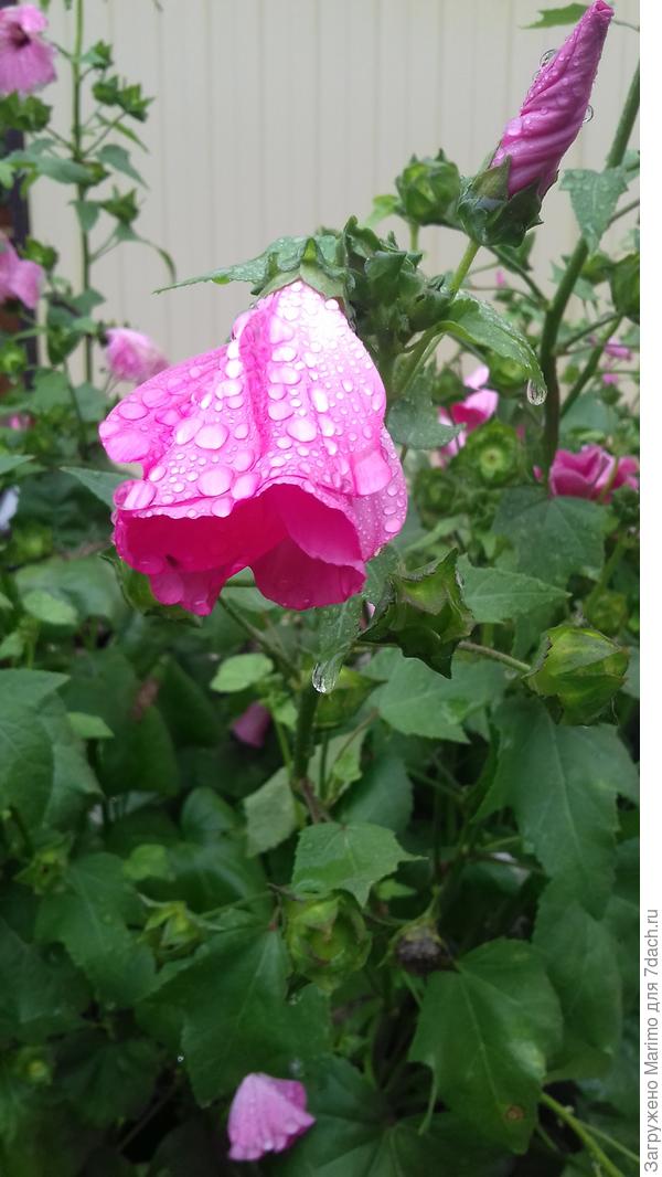 На первой фотографии капли дождя на лепестках лаватеры просто сказочно красивы!!!