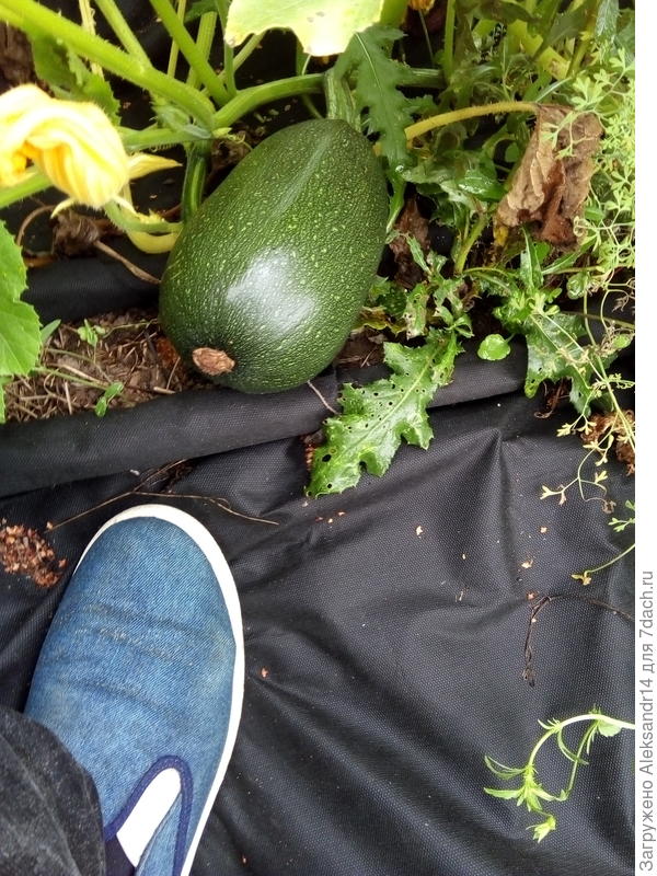 Снят первый большой белый кабачок. Ем сырым, как огурец, только срезана кожура. Подрастают зеленцы. Есть ещё хороший зелёный. Намеренно всеял присланные в компанию со старичками. Интересно, вырастут ли ярко-желтые и ярко-зелёные, также сладкие тыквы.