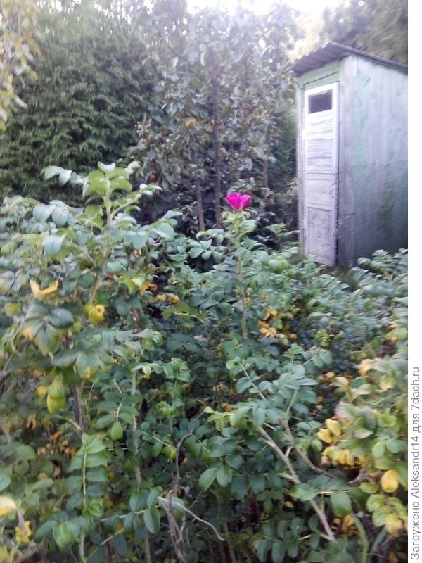 Мальва получилась в одном небольшом цветке, в городе у соседей много красивых, надо будет поменяться, пересадить уже готовые цветы (наверное, в фазе бутона). Горошек (символические стручки, цветки), да, действительно зелен и после первых заморозков.)) Шиповник — единичные цветки есть и сейчас. Физалис впервые перевёз и пересадил с корешками.