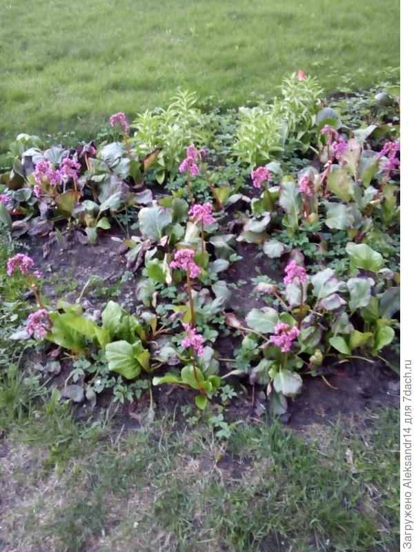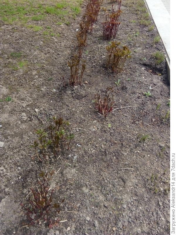 Клумбы, много активностей, местами уже цветение, местами красные ростки, местами только отметки по грунту.