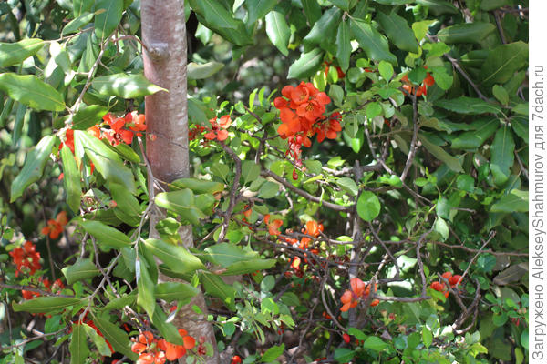 Да, это хеномелес японский (Chaenomeles japonica (Thunb.) Lindl.), семейство Розовые (Rosaceae). Декоративен в любое время года: в период цветения весной, благодаря темной зелени листьев летом, в плодах осенью. Широко используется в озеленении в групповых, солитерных и бордюрных посадках, в живых колючих изгородях и бордюрах. В парках, садах. В Крыму – повсеместно, на ЮБК, в предгорной и степной зонах. Можно использовать во всесезонных терапевтических садах разного профиля. Из-за колючести нельзя применять в озеленении детских территорий.
