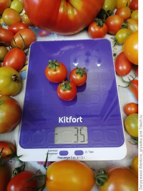 Средняя масса 25-30 граммов. Не соответствует, томатики массой 12-15 граммов. Общая масса томатов с куста всего 97 граммов.
