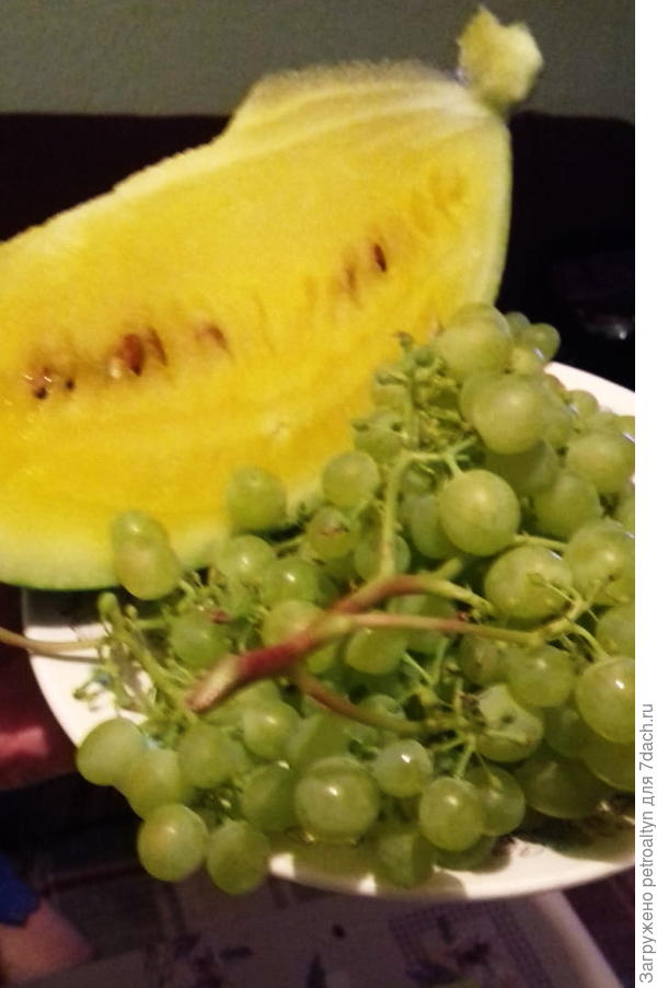 А второй арбузик, что на верхнем фото, оказался ещё крупнее — 7,055 кг. Размер его 25,5 см в длину и 23 в ширину. Толщина стенки менее 1 см. Арбузы очень ароматные, сочные и сладкие! Вкус для меня вполне арбузный, но родственники добавили, что чувствуются нотки тыквы. Только я этого не поняла. Семян достаточно, собрала для следующего сезона.