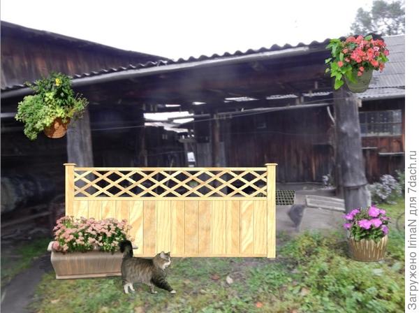 Для оформления данного уголка Вашего сада, в стиле кантри, где основной материал — дерево, хочется поддержать эту тему, что я и предлагаю сделать. А именно, расположить здесь дровницу (может быть, не закрывая целиком проем, а фрагментарно), или небольшой забор из плетня. Возможно, они не закроют территорию крытого пасторального дворика, но отвлекут на себя внимание и не вступят в противоречие с общим антуражем, в отличие от современной конструкции.