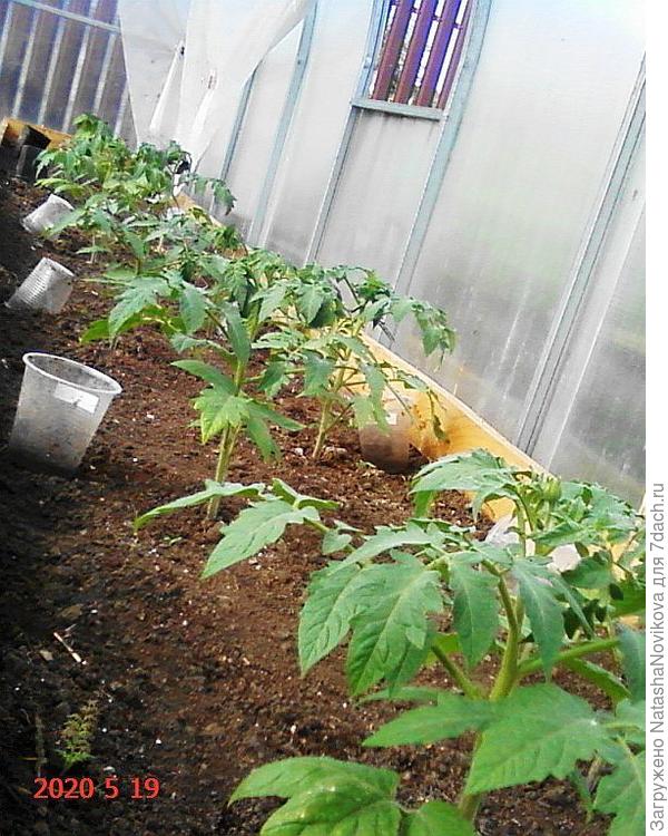 19 апреля фото рассады в стаканчиках в теплице, 19 мая фото рассады уже высаженной,