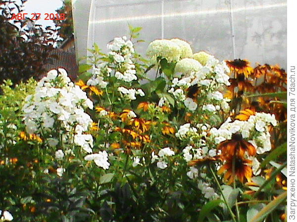 Направление с северо-запада на юго-восток, там за теплицей забор. Цветы в основном однолетние. Из многолетних хризантемы и иссоп.