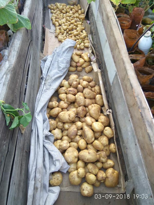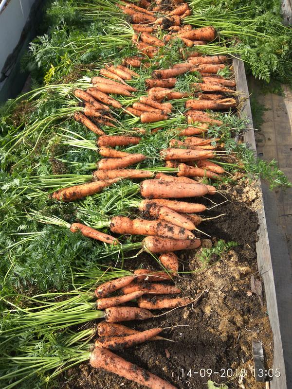 Картофель с 0,5 сотки 32-36 вёдер (по 700 г), не окучиваю, но поливаю и мульчирую. Морковь с грядки 4 метра на 85 см 8 вёдер (тоже по 700 граммов) — это, приблизительно, 56 кг, один год было 70 кг с грядки, но тогда она росла после гороха, а не картошки.