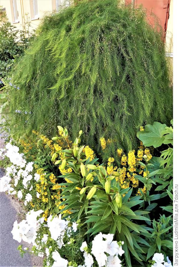 Ну и, наверное, самый распространенный вид аспарагусов — перистый. Его листья, расположенные как бы зелеными воздушными облачками, создают эффект легкости, нежности.