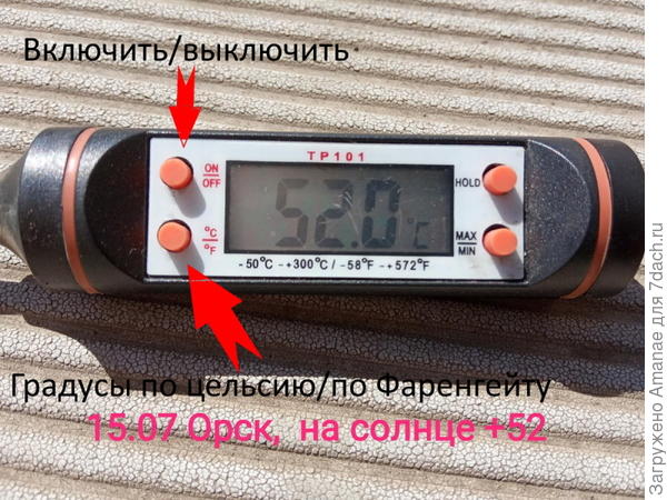 Если меняет цифры, значит, нагревается/охлаждается. Например, чтобы померить почву, я втыкаю и жду несколько минут, чтобы он зафиксировал температуру. Обычно сначала циферки «бегут», а потом медленно «тикают» и останавливаются. А так, на солнышке пока лежал, поремигивал с 52 на 53 и обратно. Но тут 1 градус погоду не сделают — в любом случае пекло