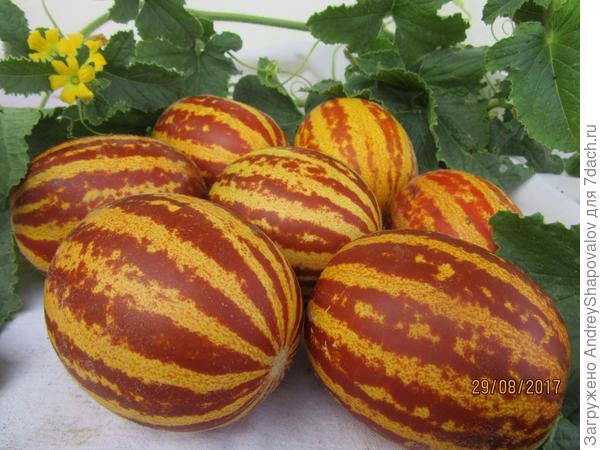Дыня серебристая — армянский огурец. Очень интересная культура с ароматом дыни и вкусом огурца. Пока зеленцы зеленые, они больше напоминают огурец, их можно солить в банки. А спелые по вкусу и аромату — дыни, из них можно варить варенье.