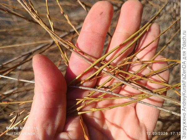 Возможно ива Ледебура (Salix ledebouriana) — одна из ив с сильно загущающимися побегами; сложно без листьев соцветий определить.