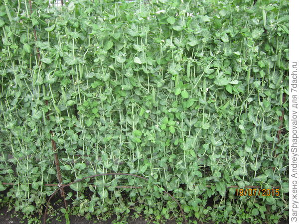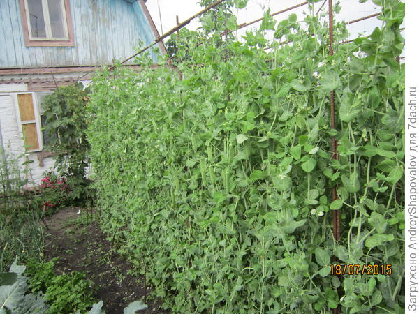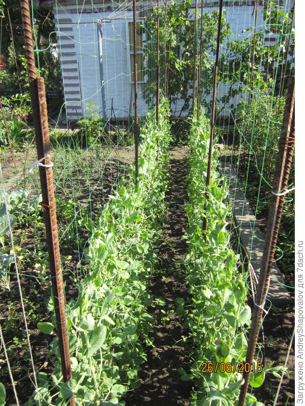 Каждый садовод много раз выращивал горох, прекрасно знает — когда замачивать, когда сажать... При перекопке грядки добавляю перегной, больше никаких удобрений. Шпалера — стандартная сетка 2 метра высотой. У меня высота каркаса получилась 2 м 20 см, так как сетка не до земли. Во время роста нужно «заправлять» по сетке растущий горох (как огурцы). Каркас и шпалерную сетку не убираю, сажу каждый год на одном месте. Это все. Все даты на фото.
