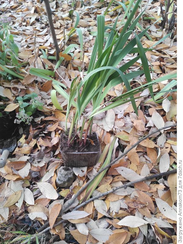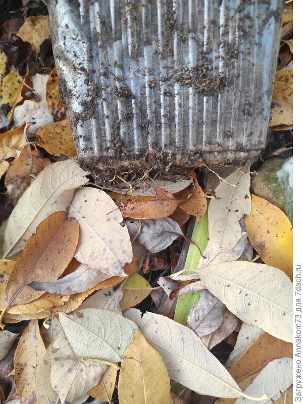 Пришлось копать букет из листьев. Хорошо, что посадила я гладиолусы в контейнер. Я очистила место посадки от листвы. Откопала землю вокруг контейнера.