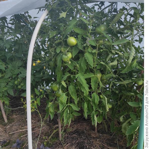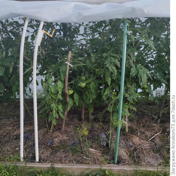 Очень странно, что у нас сейчас очень жарко, и помидоры у меня сверху были закрыты от дождя полиэтиленовой крышей.