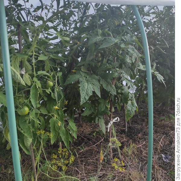 Томаты растут не в теплице, а под агрилом, каждый день полностью открываю. Поливаю крайне редко. Грядки мульчированы, неделю назад опрыскивала фитоспорином.