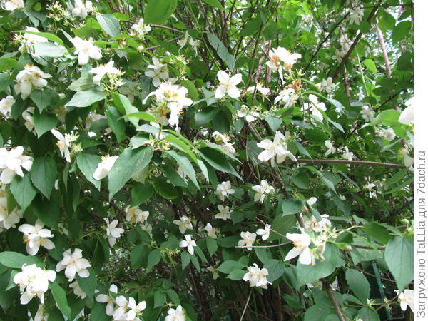 Этот красивый декоративный кустарник семейства гортензиевых в нашем саду растёт уже около восьми или девяти лет. Мы посадили его по соседству с бочкой, куда после дождя собирается вода с крыши. Он старательно закрывает её неприглядный вид. За это ему достаётся достаточно воды, так как бочку приходится периодически осушать, менять в ней воду. И чубушнику хорошо, ведь он влаголюбив.