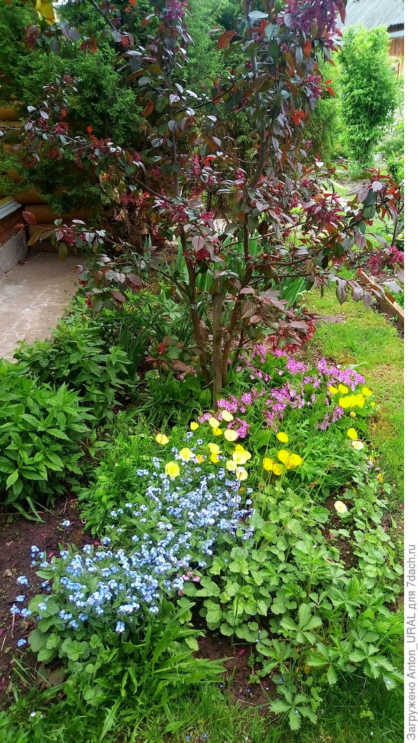 А вот фото клумбы с незабудками, примулами и жёлтыми маками, посаженными около декоративной яблони Роялти.
