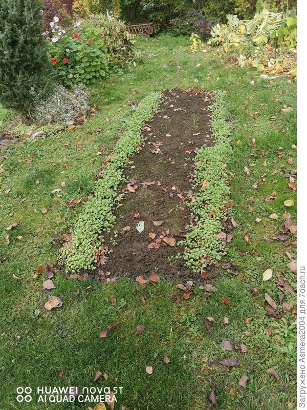 По краям грядки посыпаем семена горчицы. Пусть лучше в зиму уходит она, обогатив грядку азотом, чем сорняки. Земля голой оставаться не должна. Проливать грядку сверху не будем. Увы, и так дожди через день. Будем надеяться, что чеснок не прорастет, а ранней весной проснётся и сразу пойдёт в рост. На днях муж будет косить траву, грядку прикрою мульчей.