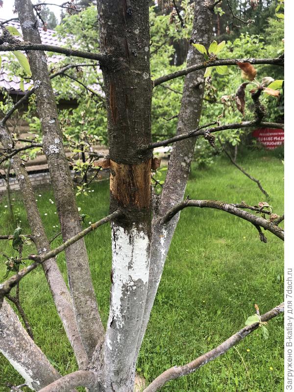Ооо. Ну вот это уже явно видно, что морозобоины. Для таких яблонь, как ваша — стандартная ситуация (обычные не низкорослые яблони этому подвержены в значительно меньшей сте6пени, а в молодом возрасте вообще практически не подвержены). Если бОльшая часть ветвей выше этого места — усохшие, то всю эту ветвь полностью вырезать на кольцо (не оставляя пенька).