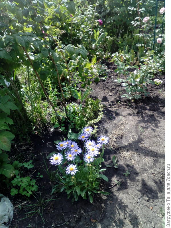 Ходила я, бродила по участку дня три.., ничего в голову не приходило. И тут мой взгляд упал на разросшиеся «плюшки» возле другой дорожки, которая тоже на солнце. Альпийская астра!