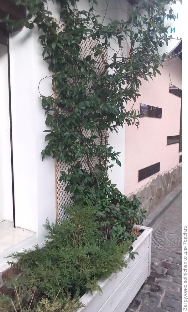 В нескольких местах видела посаженный трахелоспермум в грунт, в одном месте растёт как- бы в ограниченном пространстве (сделанные из бетона контейнеры по уровню грунта), когда мало места около забора.
