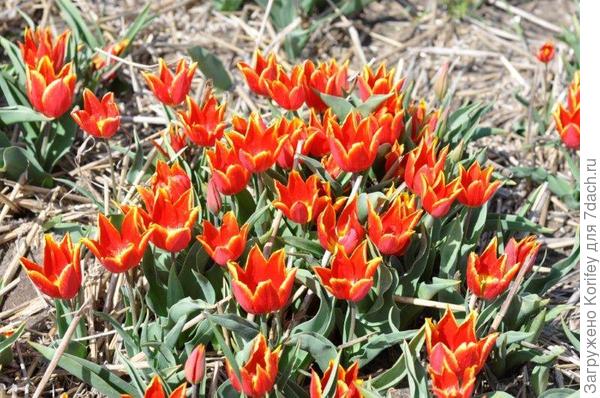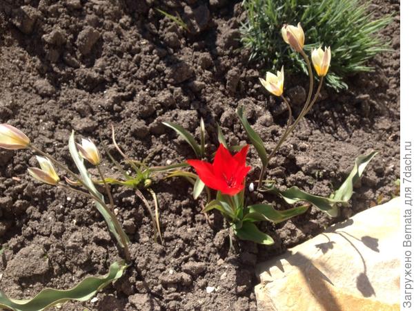 Тюльпан ботанический hageri на клумбе. Его высота примерно такая же как и у мускари, может быть выше иногда сантиметра на 2-3