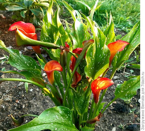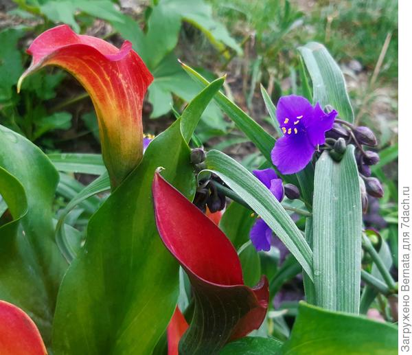 В прошлом году рядом с каллами росла традесканция, а у них схожие условия, неплохо смотрелись вместе...