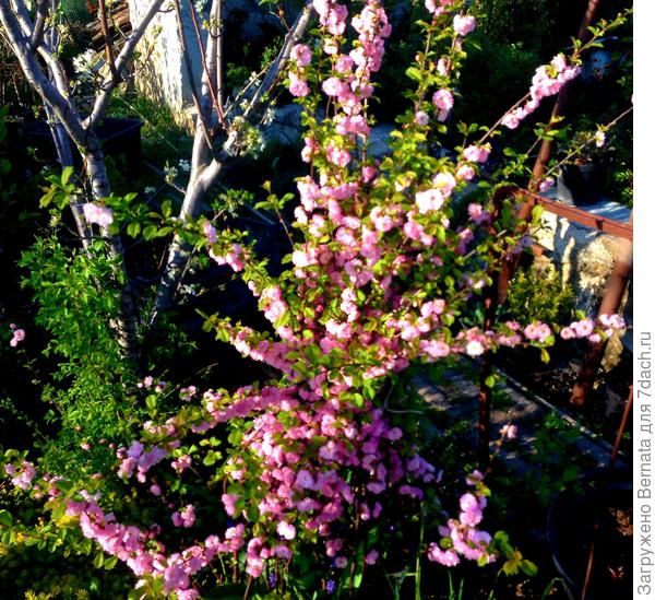 Цветение начинается до появления листьев, уже в конце марта, длится не менее трёх недель и ярко-розовые махровые цветки с миндальным ароматом полностью покрывают длинные раскидистые ветви, не мешая появлению первых нежных листочков.