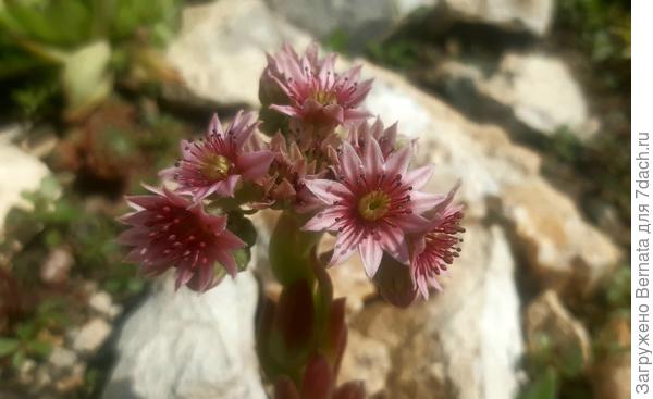 Цветки у этого молодила лилово-розовые, на цветоносе высотой около 15-20 см.