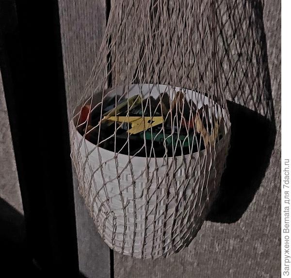 Также давным-давно в подобной авоське у меня лежат бельевые прищепки, которые, как и многие, я изначально цепляла на связанный шпагат, но потом поняла, что когда снимаешь бельё, крепить прищепки к шпагату напряжно:)