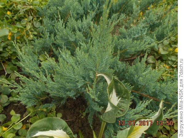 Эти можжевельники накрываю. Зеленый пестрый — это Вариедата, если не ошибаюсь. Сизо-голубой — какой-то из стелющихся… Оба ооочень медленнорастущие.