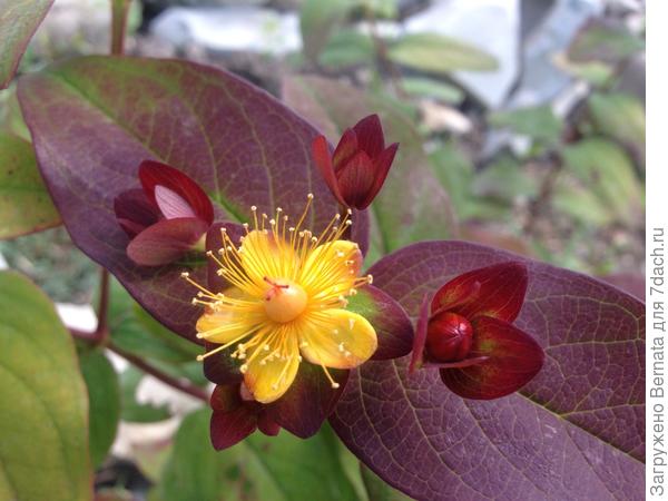 Внешне он мне очень нравится и является одним из моих любимцев .., а его золотые «лютики-цветочки» с красными тычинками очень хорошо подчеркивают кроваво-красные листья.