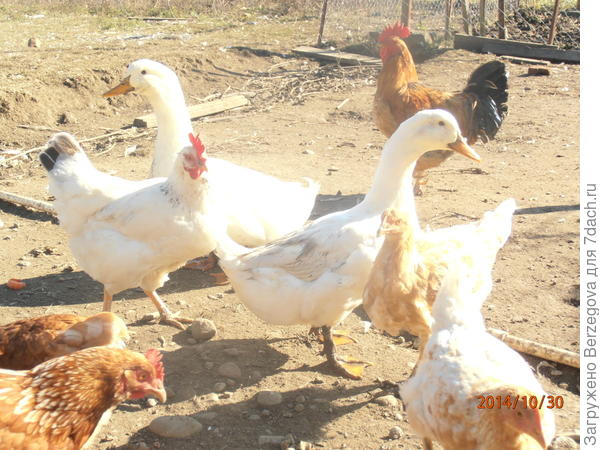 В конце сентября был дождь, курица привела выводок, 12 цыплят, только что высиженных ей в зарослях малины. Пришлось принимать нежданное прибавление в хозяйстве. Наседка ревностно охраняла своих питомцев, учила, как добывать пищу, защищаться от врагов.